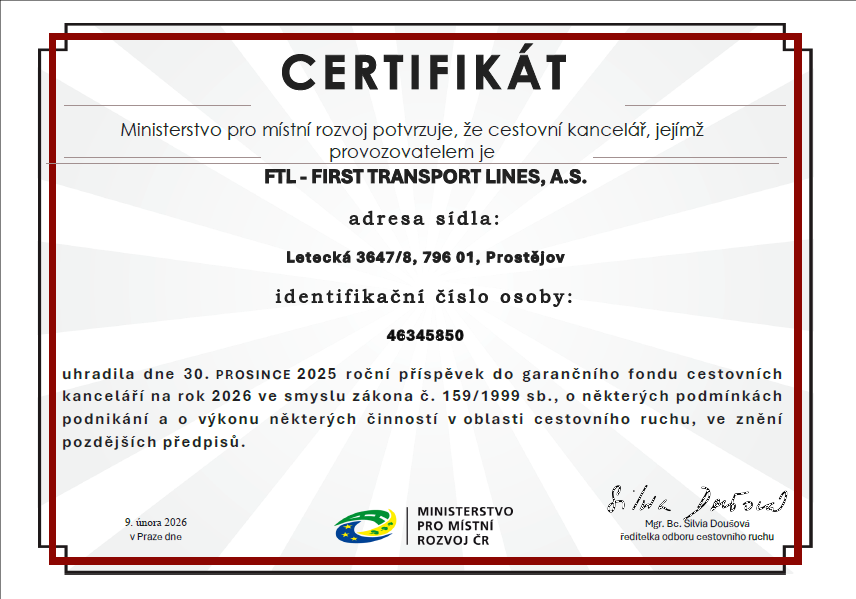 FTL - First Transport Lines, a.s. Prostějov, jakožto provozovatel CK FTL splnil všechny náročné požadavky zákona 159/1999 Sb. a dne 15.6. 2001 obdržela KONCESNÍ LISTINU, kterou pod evidenčním číslem 370900 - 49222 - 00 vydal OKRESNÍ ŽIVNOSTENSKÝ ÚŘAD OKRESNÍHO ÚŘADU V PROSTĚJOVĚ.